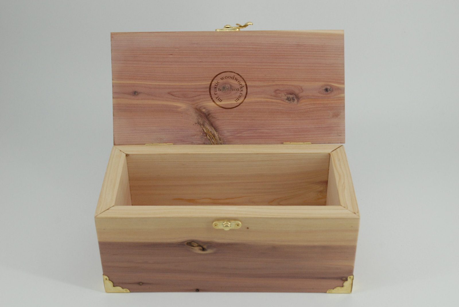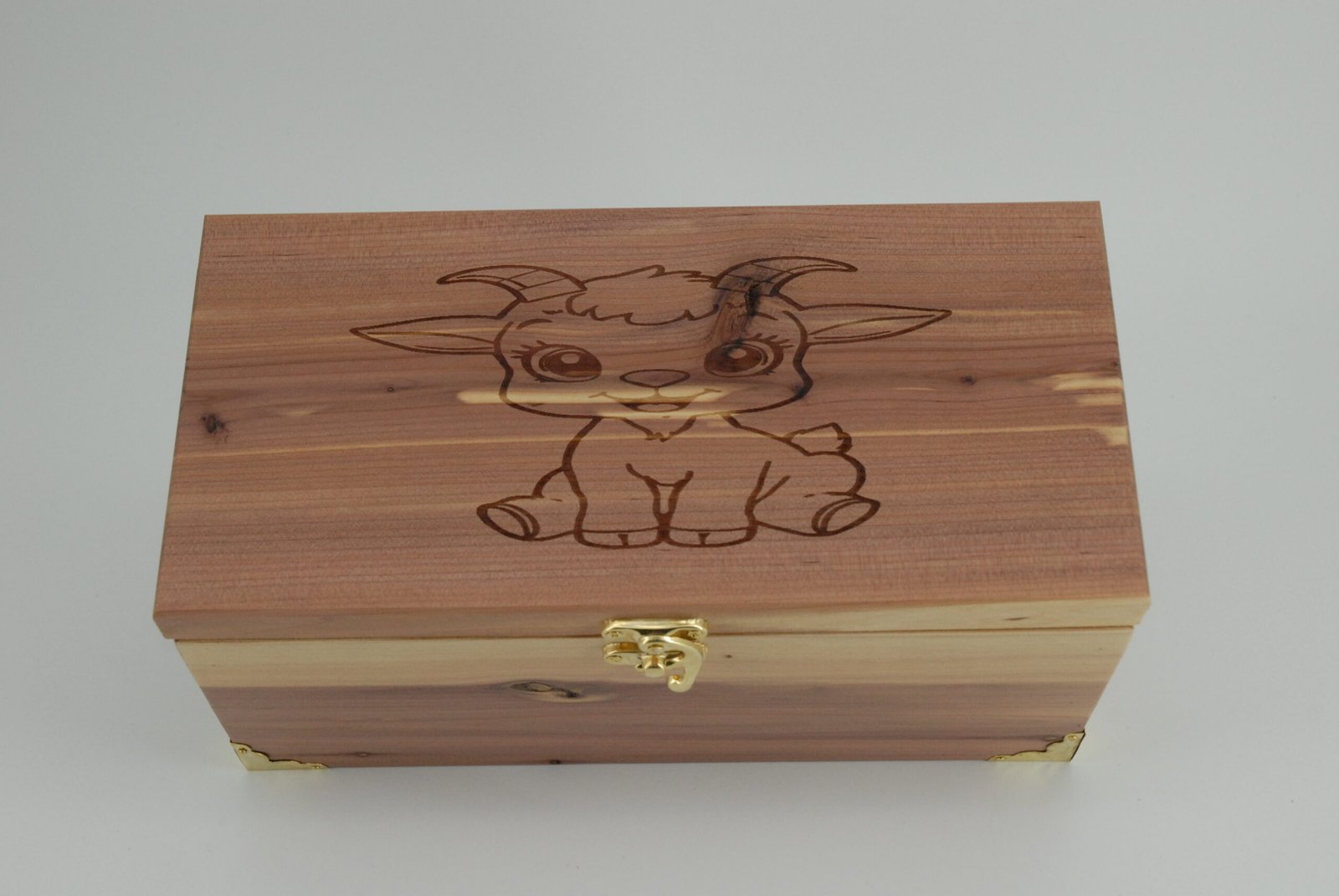 Store your treasures in style with this charming cedar keepsake box, featuring a laser-engraved adorable baby goat illustration. Natural wood grains, sturdy gold-toned hardware, and a unique handcrafted feel make it perfect for jewelry, mementos, and gifts. Delightful and functional, it brings warmth and character to any space.