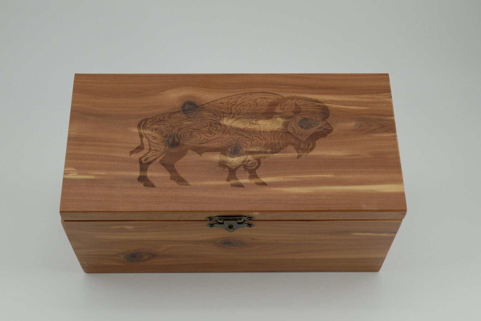 Handcrafted cedar storage box with engraved bison design