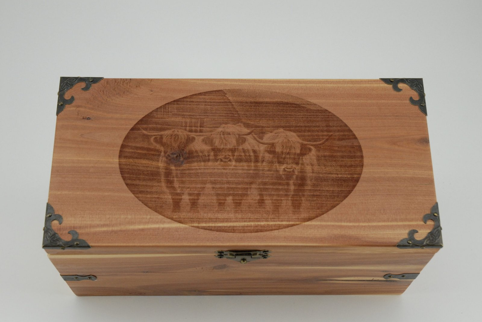 Bring a touch of rustic charm to your home with this beautifully engraved wooden keepsake box featuring a cow motif. Crafted from high-quality wood, this durable box boasts intricate metal corner accents and a secure latch for safe storage of your treasured items or jewelry. Perfect for gift-giving, rustic d?cor, or personal use.