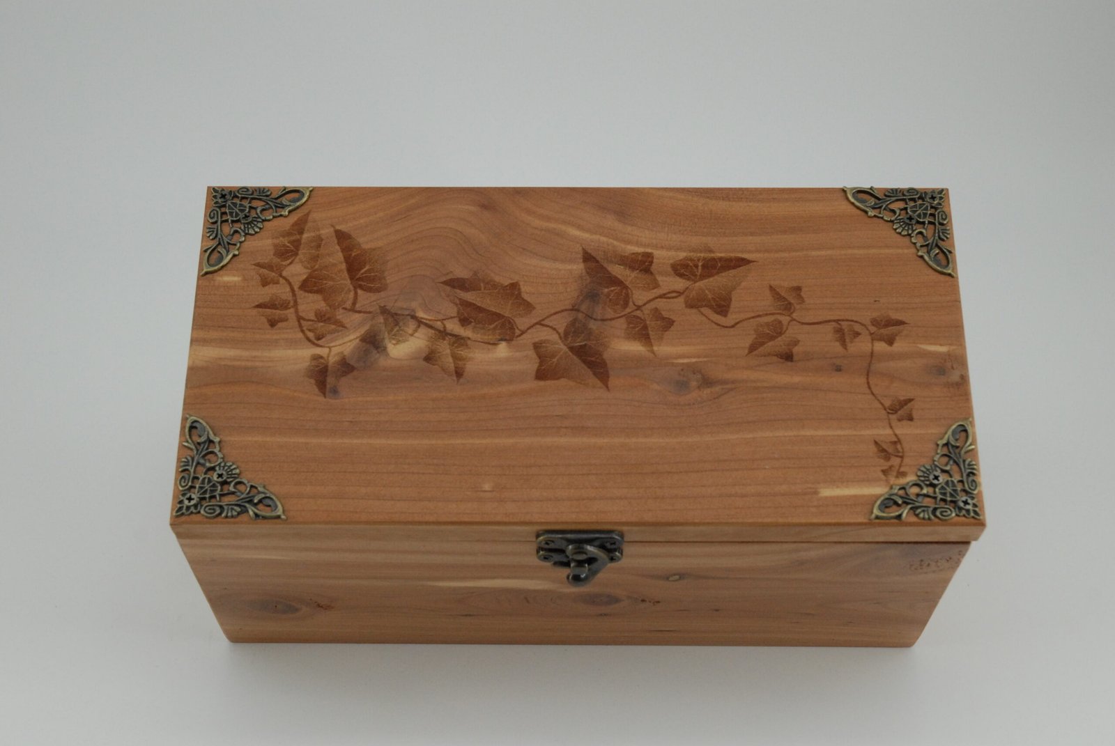 Handcrafted cedar storage box with engraved ivy design