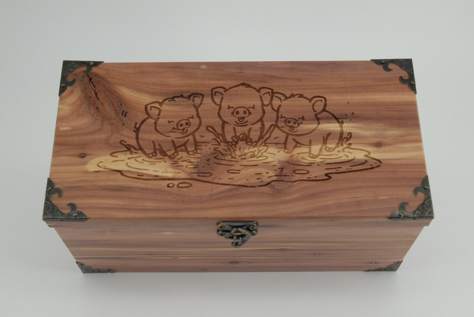 Handcrafted cedar storage box with engraved piglets design
