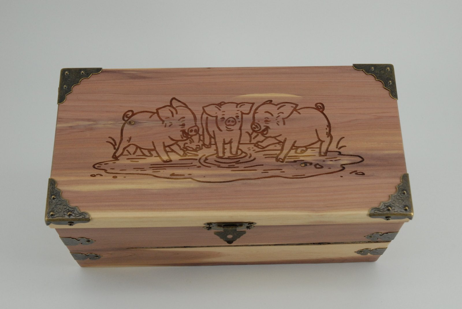 Handcrafted cedar storage box with engraved piglets design