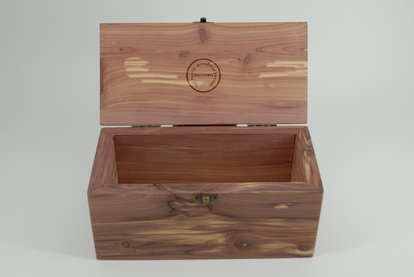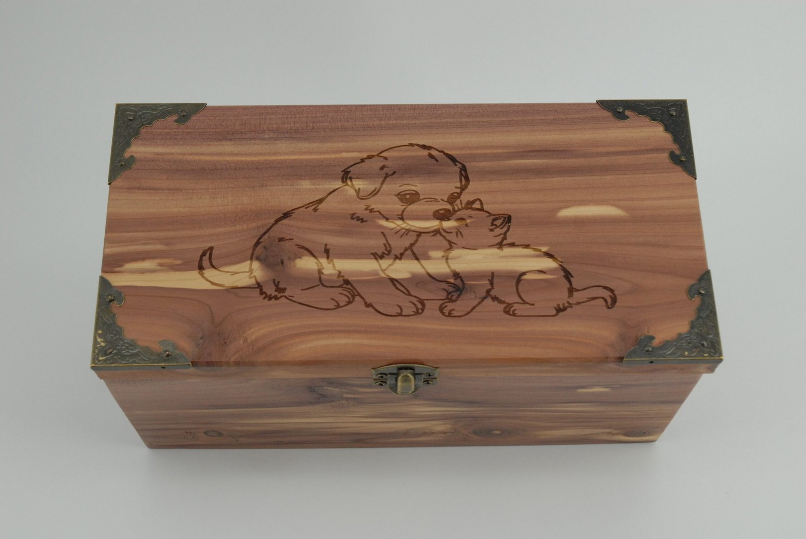 Handcrafted cedar storage box with engraved puppy and kitten design