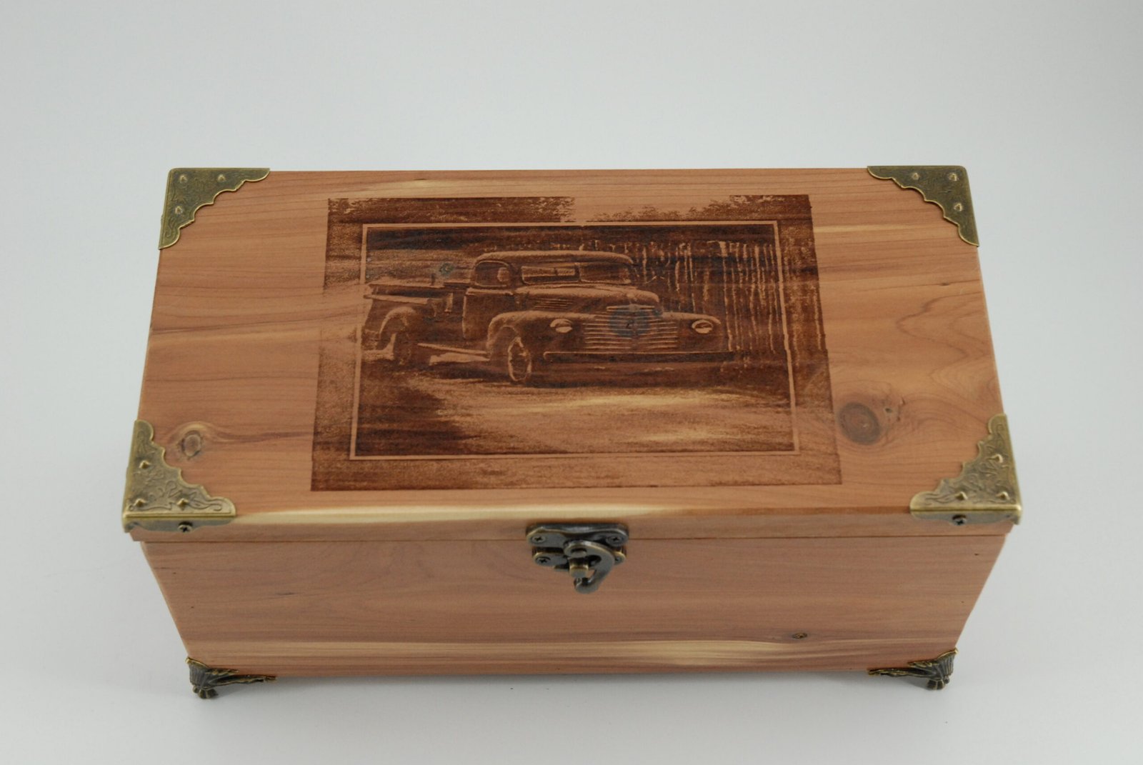 Handcrafted Wooden Treasure Box with Classic Truck Engraving – b2503063